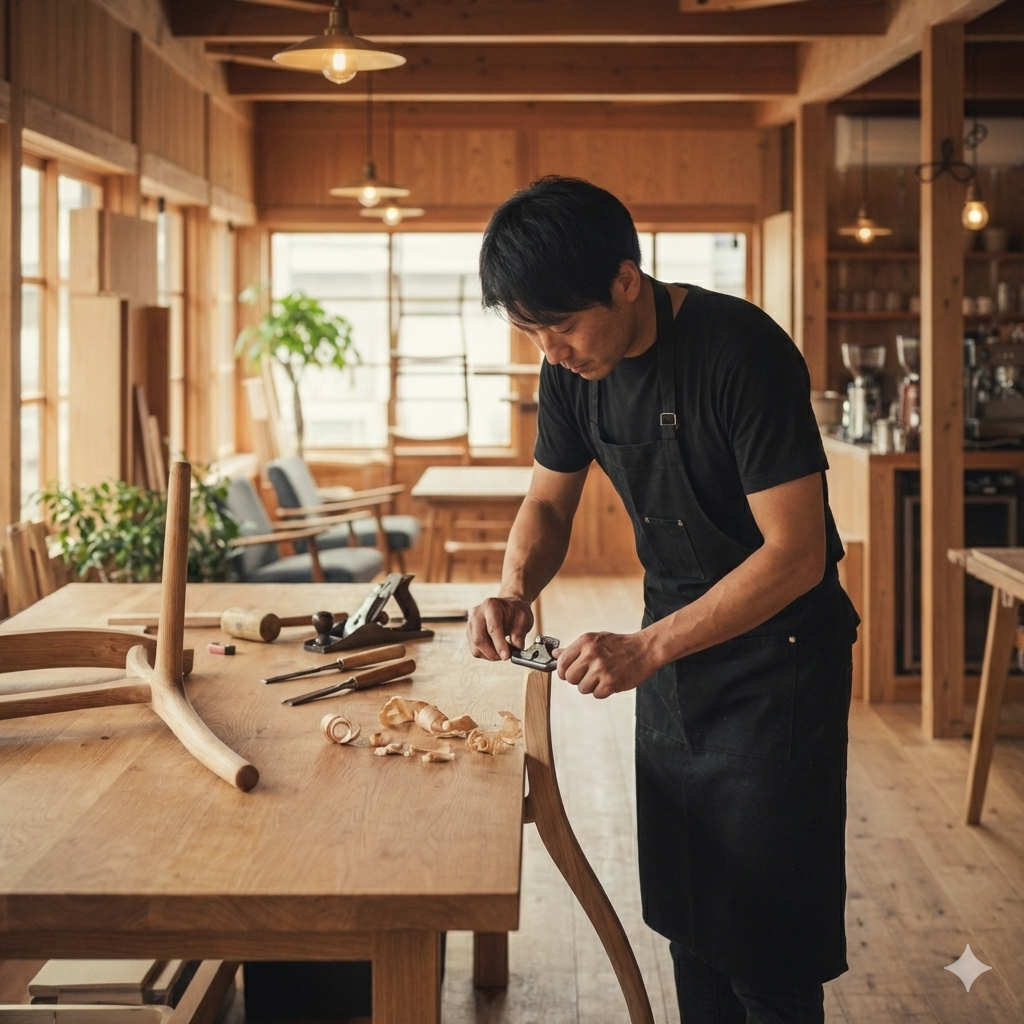 既にご紹介したCAD設計とNCルーターによる精密な切り出し、そして職人の手による細やかな整形。 複雑な形状の特注家具や、ミリ単位の精度が求められる大型壁面収納も、自社工場内でスムーズに連携。設計と製造の距離が近いため、現場での急な仕様変更や細かなディテール調整にも即座に対応できるのが私たちの強みです。 - 椅子・大型家具・特注家具への対応力
