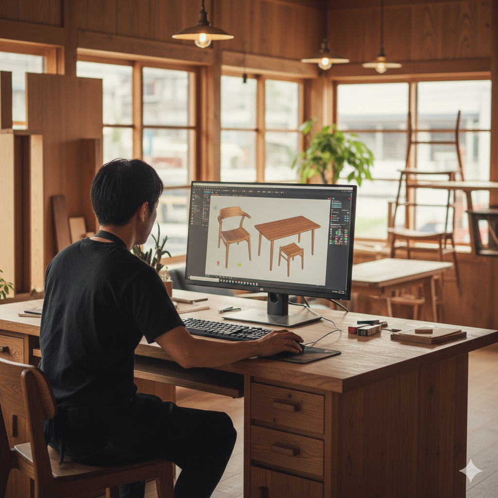 石井木工では、お客様の理想を形にするための「設計力」と、それを寸分違わず具現化する「最新鋭の設備」を備えています。特注家具ならではの複雑な構造も、デジタルとアナログの融合により、高い精度で実現いたします。